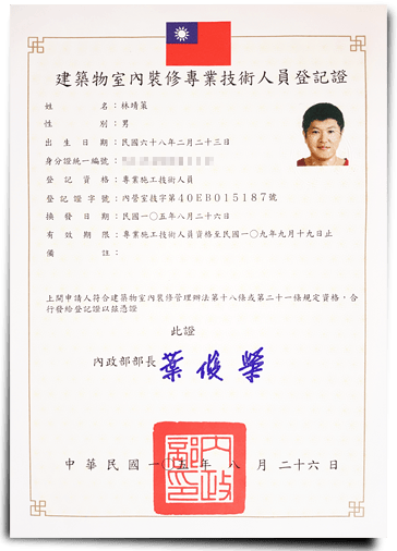 專業技術證照:持有「建築物室內裝修專業技術人員」國家證照,合法合規,誠信保障 。